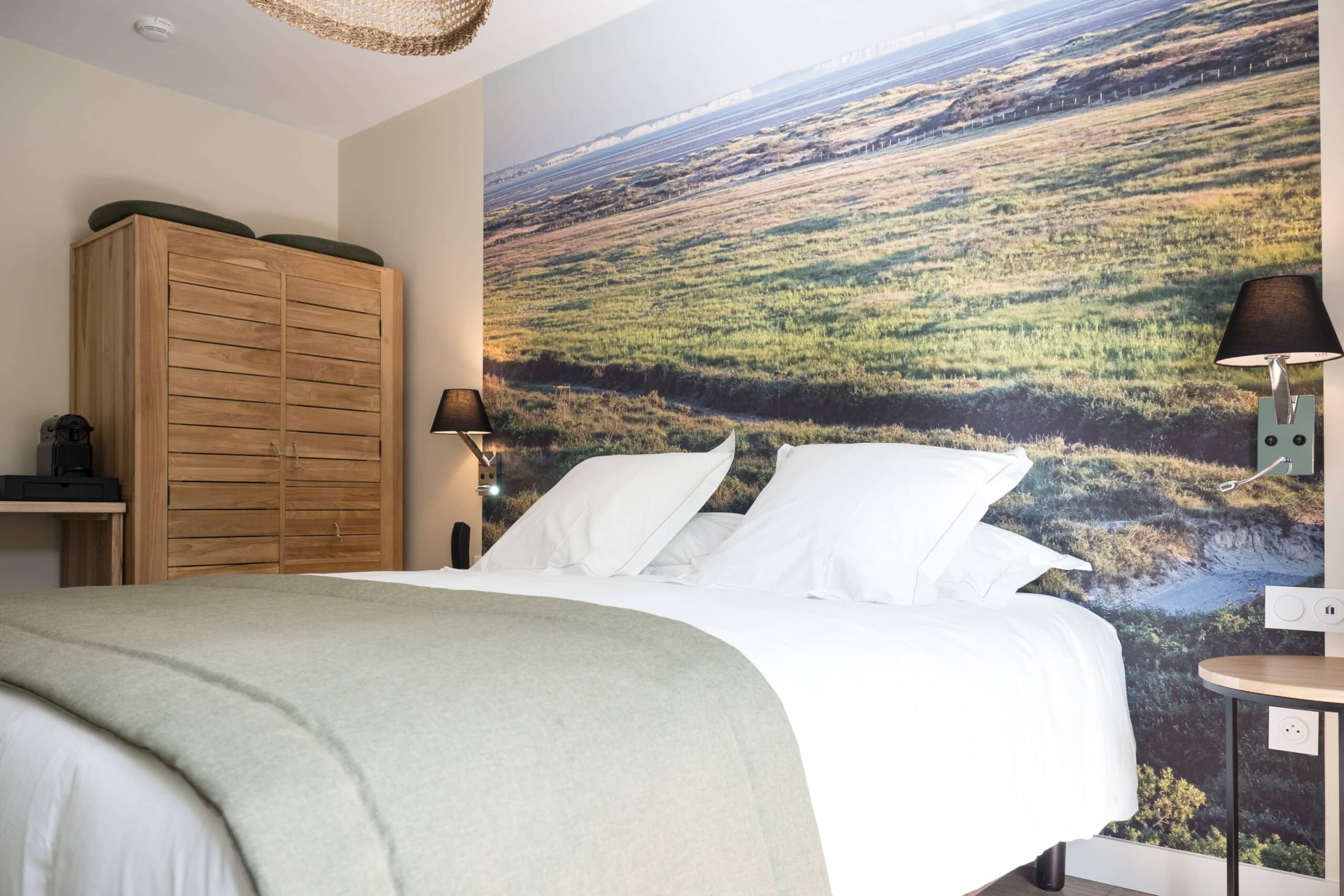 Au-delà des fenêtres, Norlinge a également apporté une touche distinctive à la literie en réalisant les chemin de lit sur mesure, décliné dans une teinte pistache, en écho direct à la végétation environnante.
