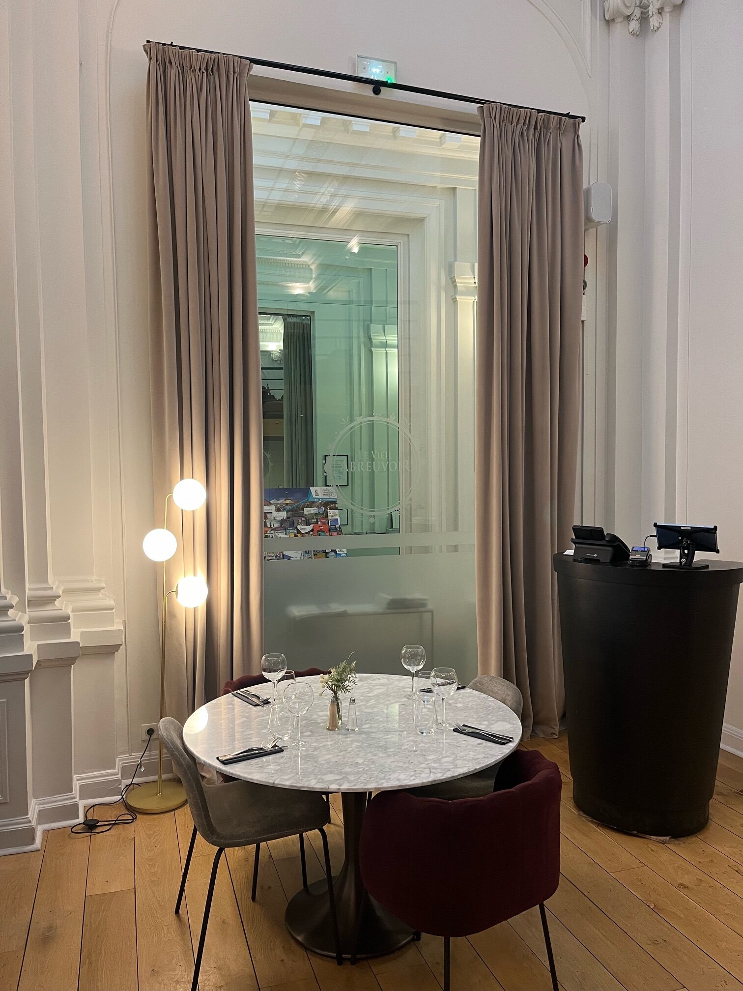 👉Dans le cadre de notre contribution au Mercure Lille Roubaix Grand Hôtel, nous avons réalisé une mise en scène élégante et contemporaine en harmonisant des matériaux haut de gamme. Les rideaux en velours double face, confectionnés avec une tête à plis doubles, mettent en valeur le tissu Sensation de notre gamme Verso Atelier, apportant une ambiance feutrée et luxueuse à l’espace. Pour parfaire cette réalisation, nous avons choisi le voilage "Adria" effet lin, doté d’une tête fourreau, qui diffuse une lumière douce tout en conservant une esthétique naturelle et sophistiquée. Cette combinaison parfaite incarne un équilibre entre raffinement et fonctionnalité, rehaussant le charme intemporel et historique du lieu.