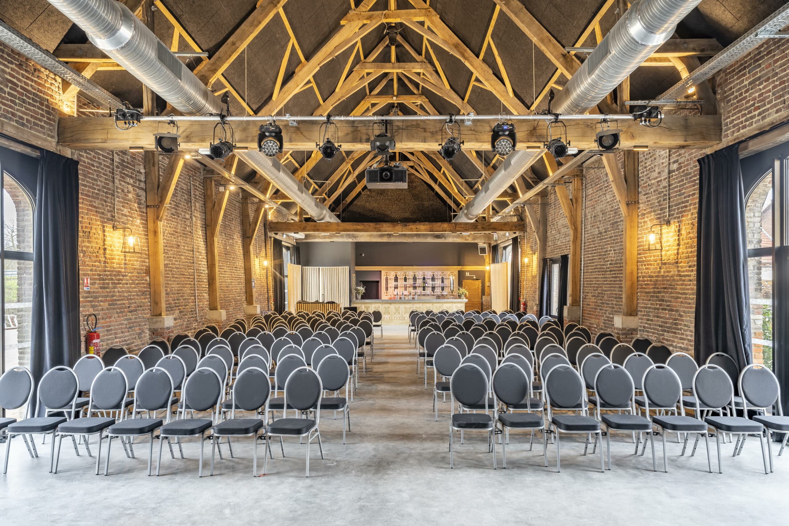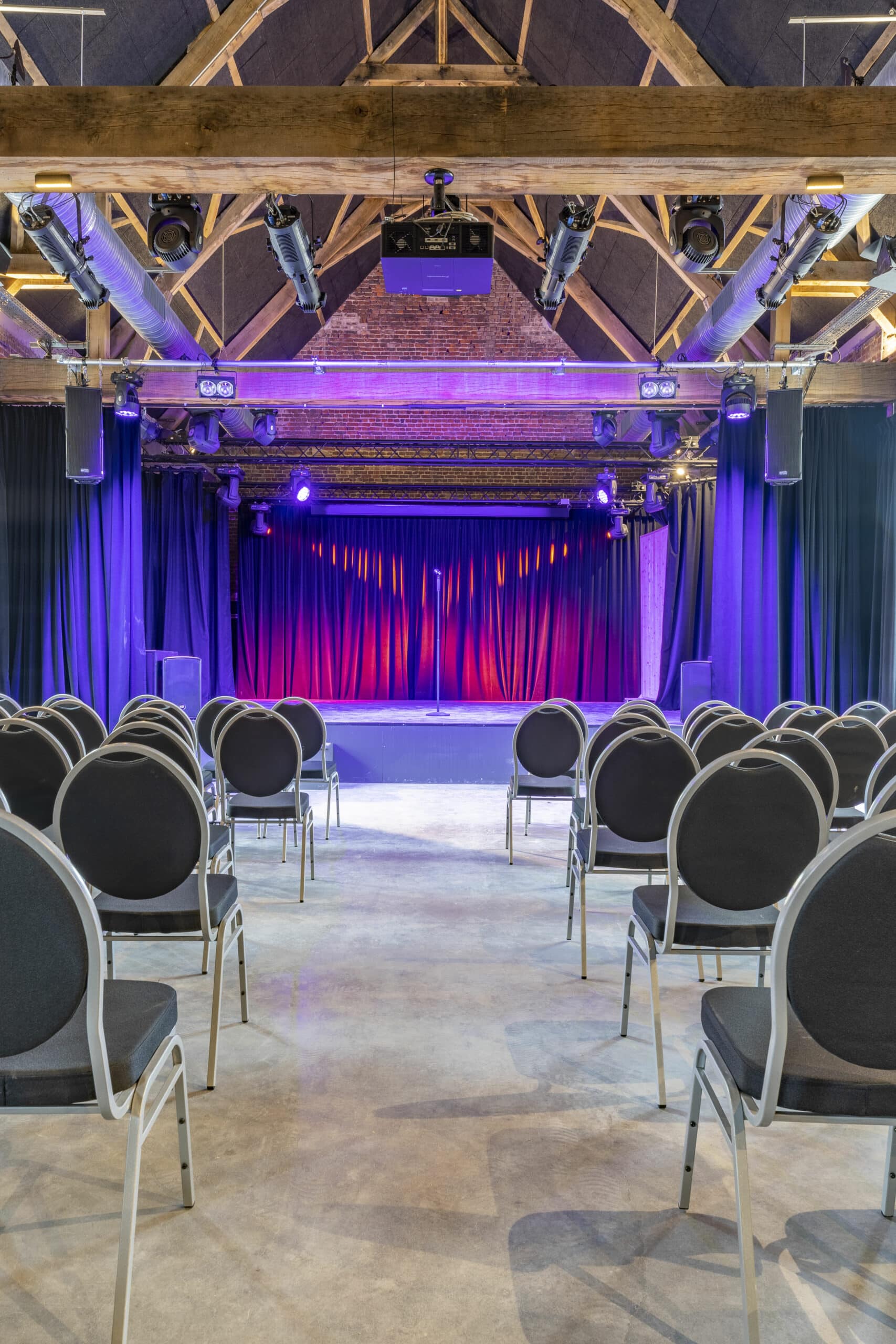 Pour la scène, Norlinge a confectionné de grands rideaux sur mesure adaptés à la hauteur et à la largeur de la Grange. Le choix s’est porté sur un tissu velours : une matière qui apporte présence visuelle, profondeur, et une contribution acoustique appréciable dans les grands volumes.